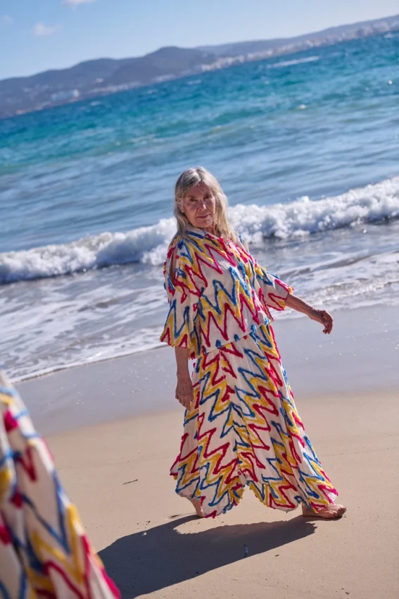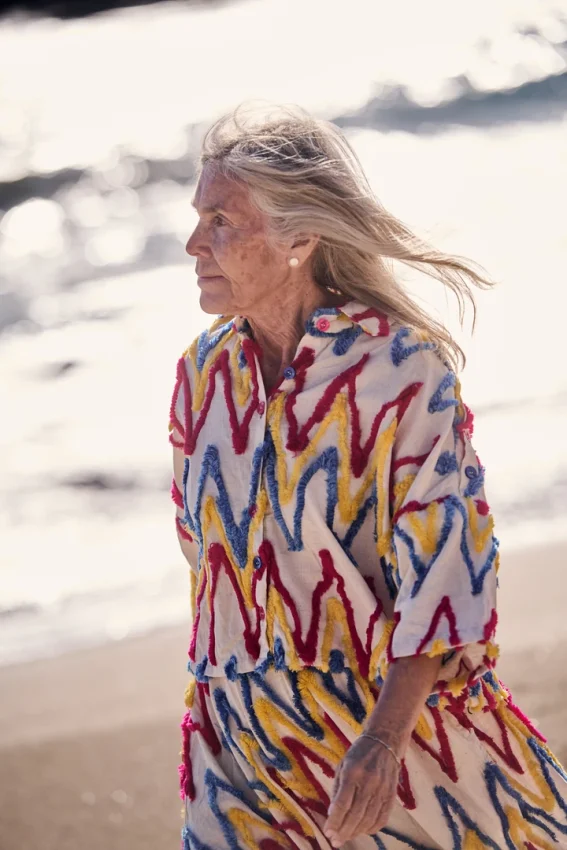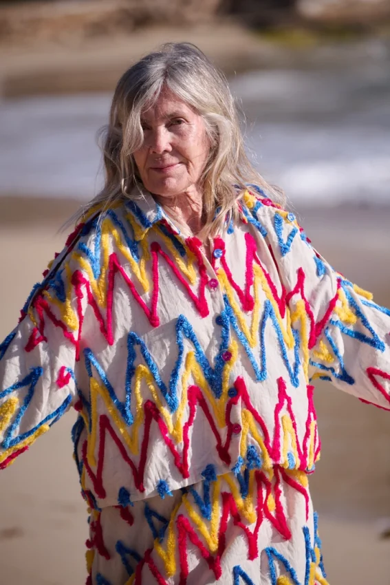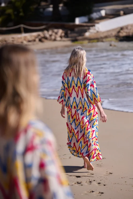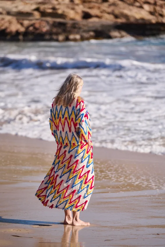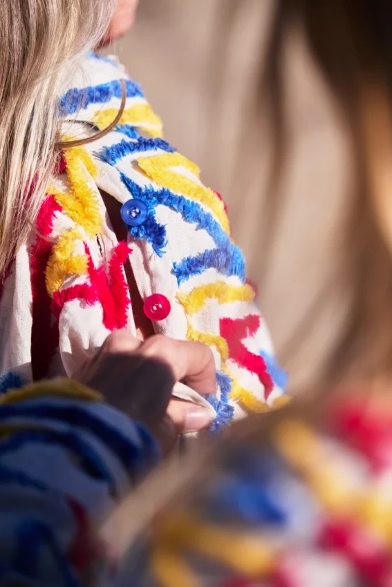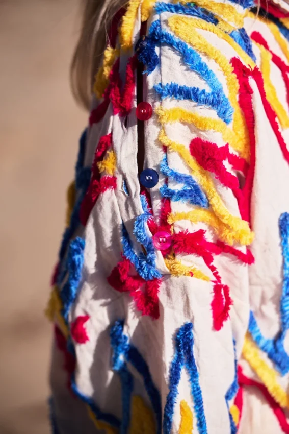 Organic cotton with wool embroidery. Buttoned at the front, with shoulder openings and coloured buttons that add an unexpected twist to the silhouette.