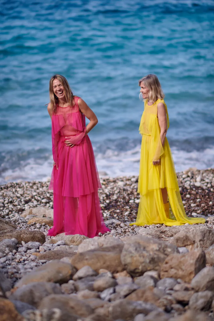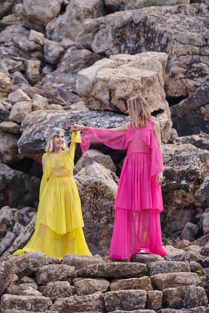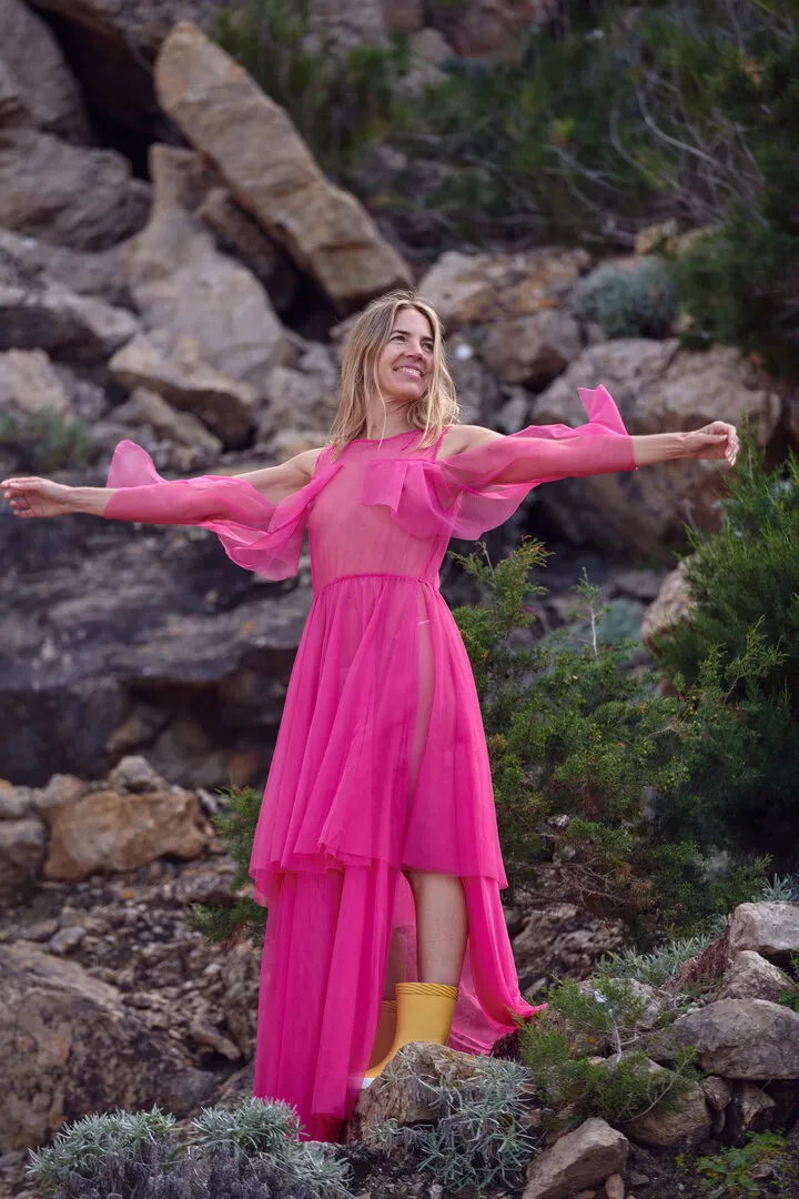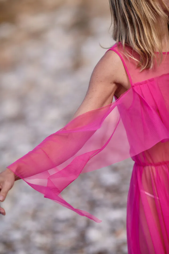 A delicate opening at the back makes it easy to slip on the dress, subtly remaining slightly open when adjusting the collar with a fine tulle cord. The elastic waistband contours to the silhouette, accentuating the figure and ensuring a comfortable fit.