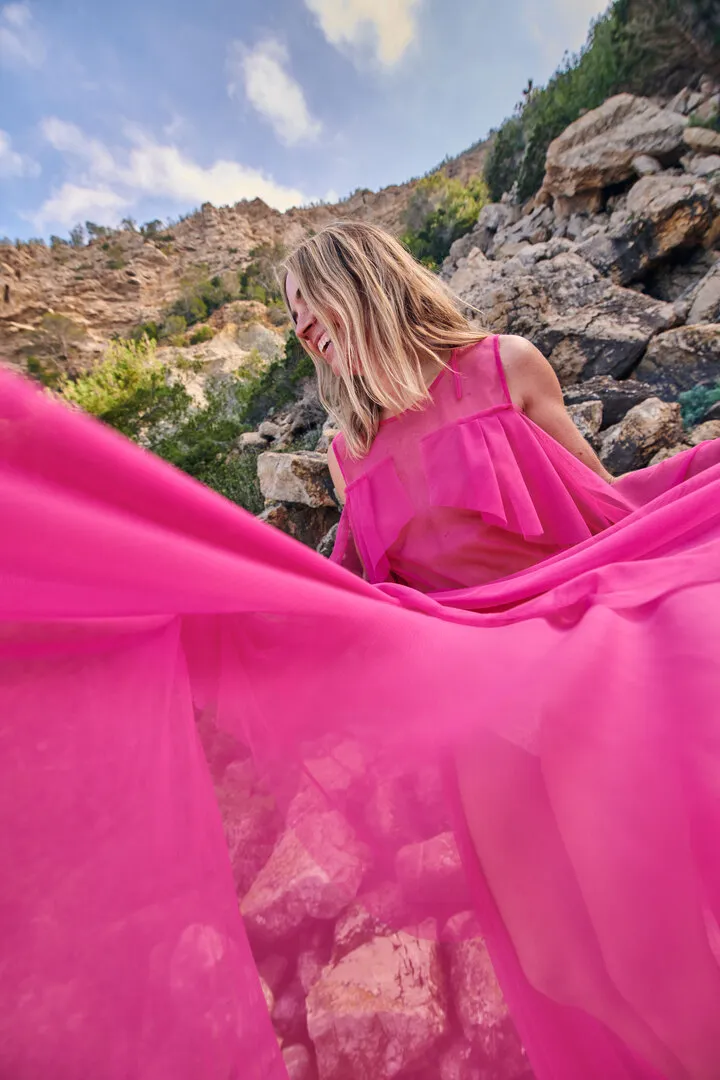 This tulle dress is designed to make you feel like a princess. It features two long layers that flow from the waist and elegant side slits.