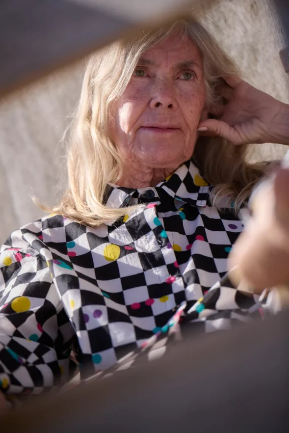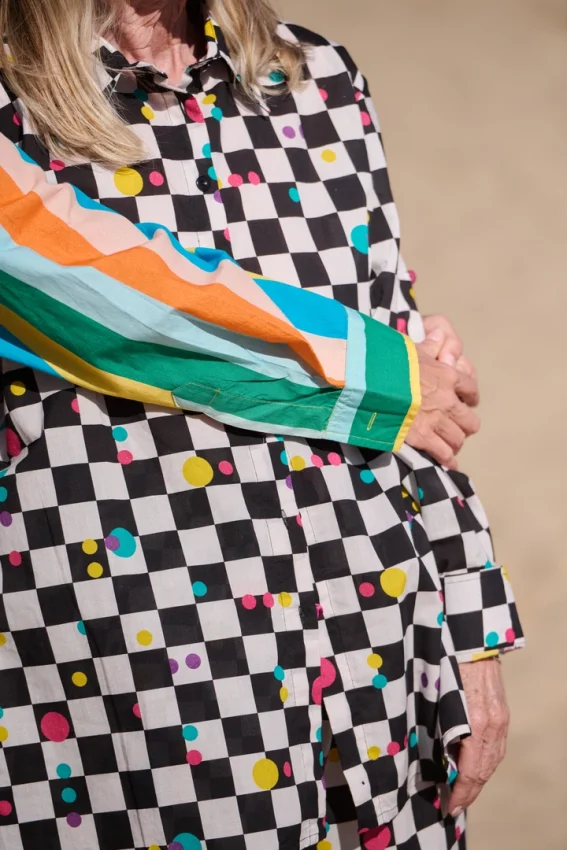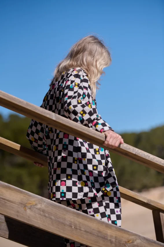 De manga larga y cuello clásico, presenta apertura delantera y trasera, aportando movimiento y diferentes formas de llevarla. Los botones, todos distintos, le dan un toque inesperado y personal.