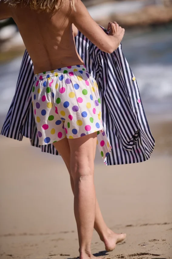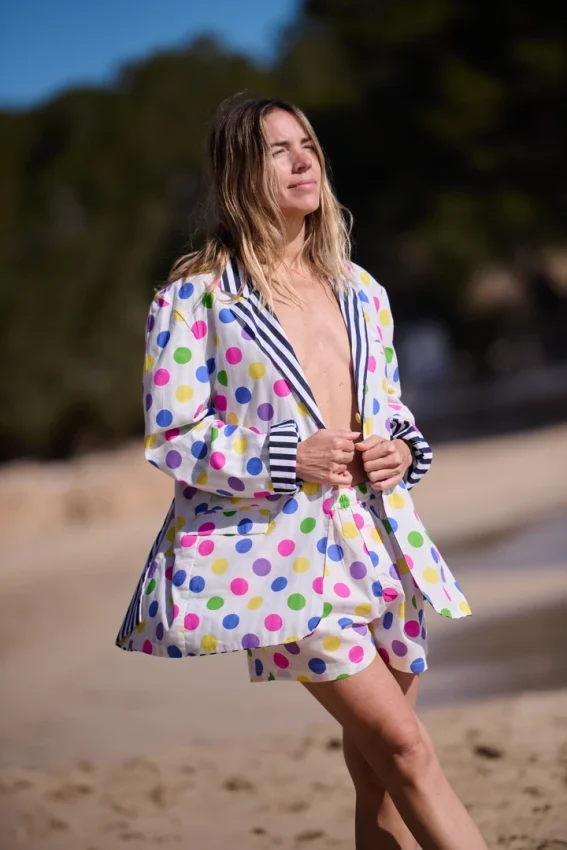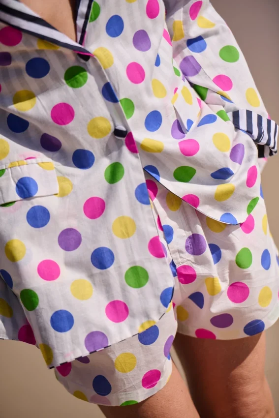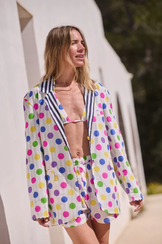Ligero y cómodo, con un estampado de lunares de colores que no pasa desapercibido. Una pieza pensada para jugar: llévalo solo o combínalo con el blazer o el top.